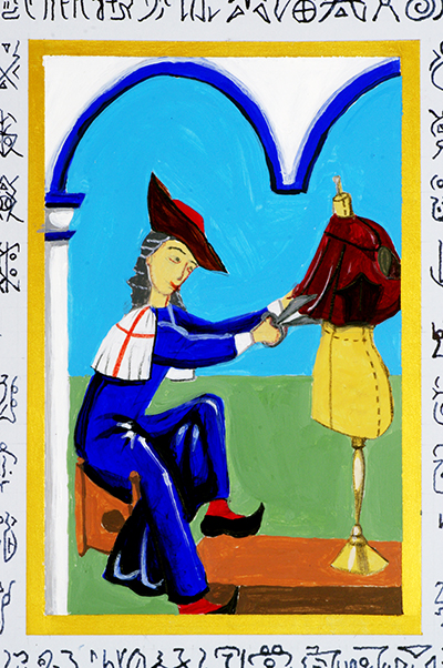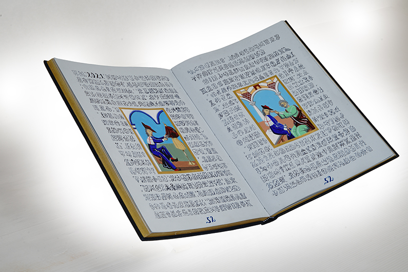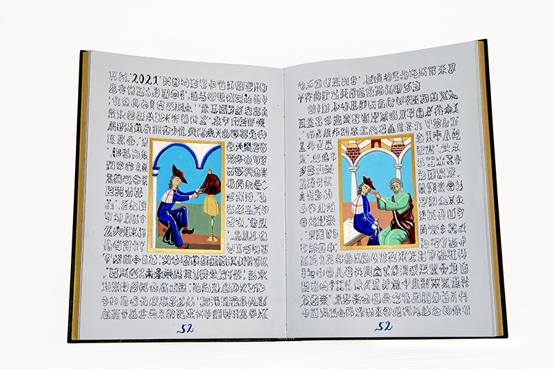 KENICHI ICHIKAWA Black Labelでは、ハインリヒが、洞窟の隠者ホーエンツォレルン伯に見せてもらった未知の言語で書かれた書物に着想を得、私自身の過去・現在・未来を錬金術の魔術的で、青い装丁の本に、架空の文字で綴りました。挿絵には現在の私の姿が中世風に描かれています。私の結末はノヴァーリスの死で中断された「青い花」と同様、未完です。