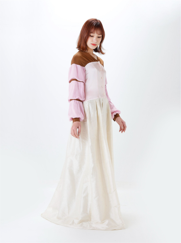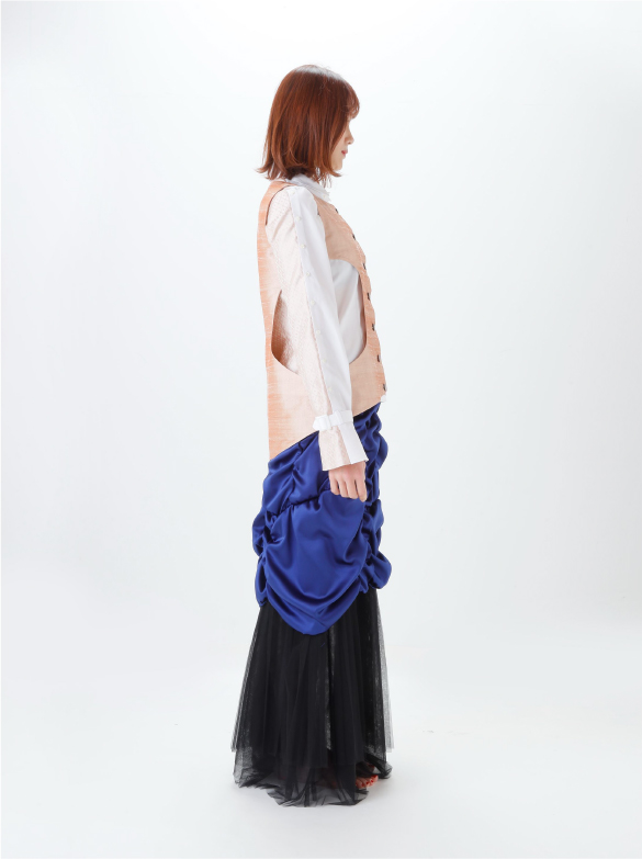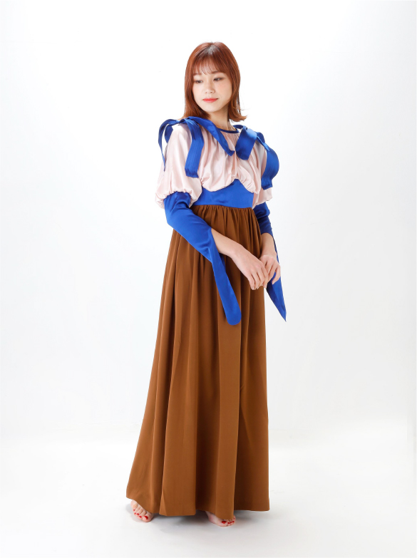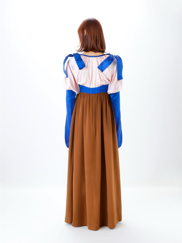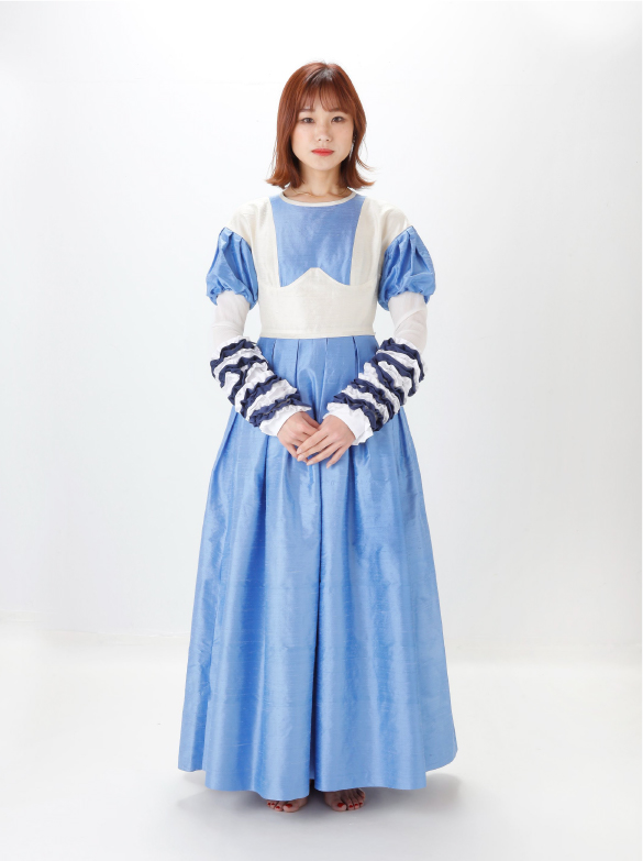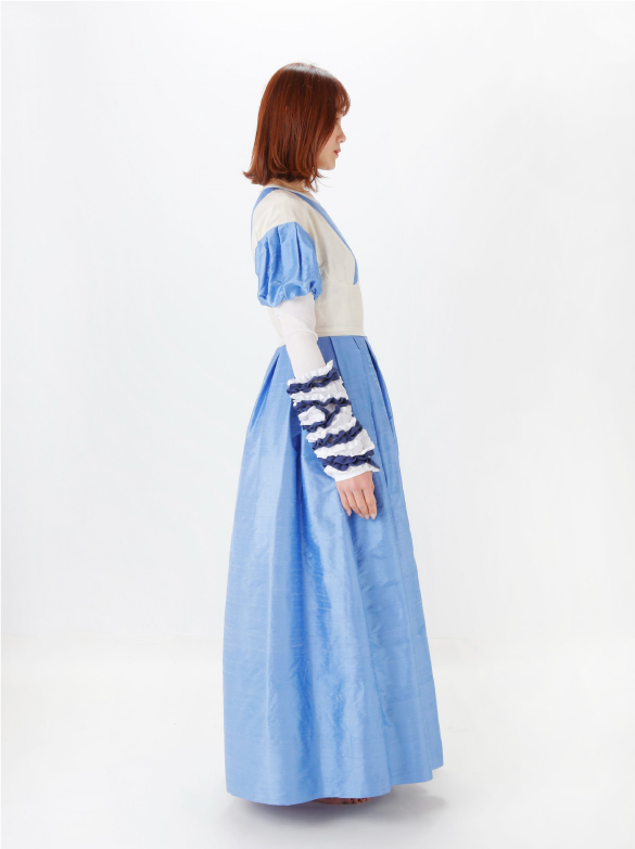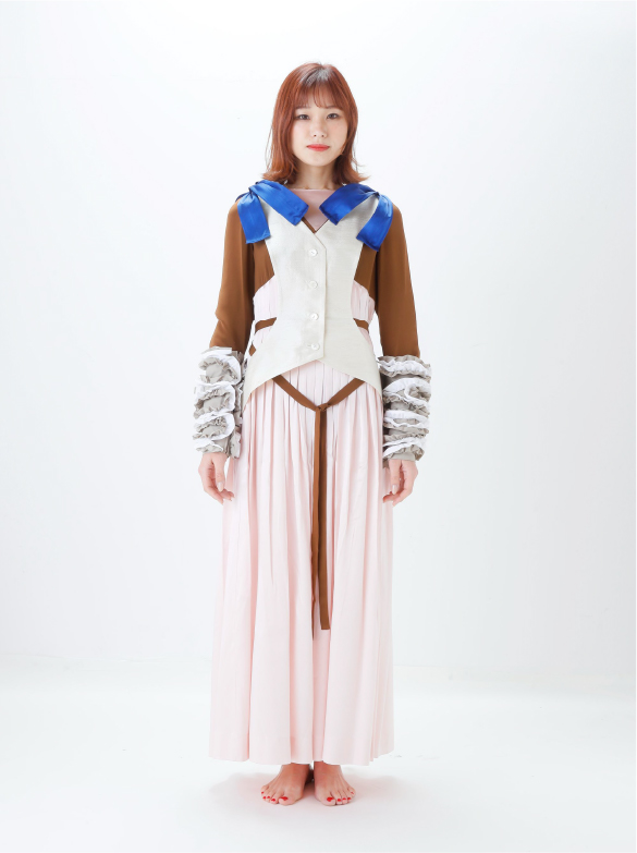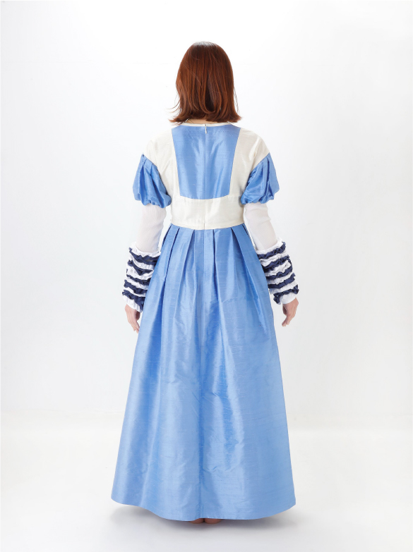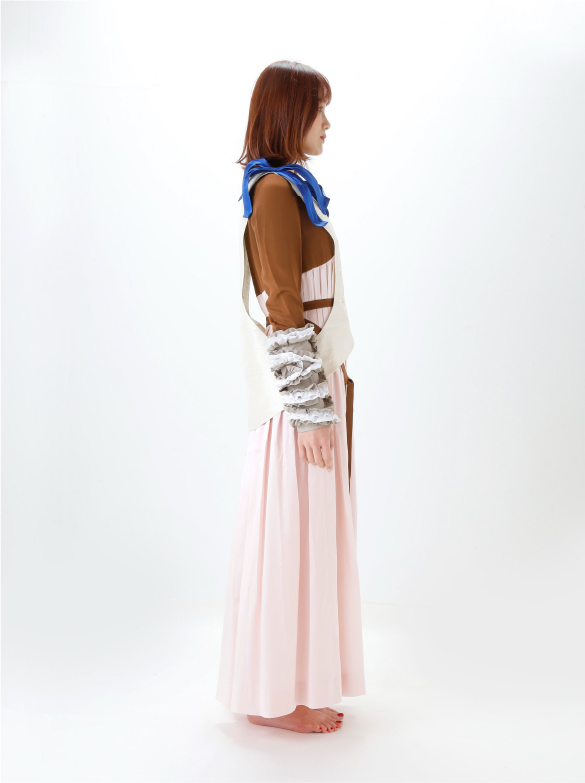 White Labelでは青い花を肩に付け、錬金術の魔術的なテイスト、緩やかなロング丈の外套の一種(ウプランド)、チュニック型衣服(コット)、ロング丈の上着(シュールコートゥベール)などをデザインに落とし込みました。